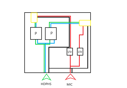 1. Chcę zrobić w komputerze złącze typu Combo-Jack (L, P, GND, MIC+) z wykorzystaniem złącza AUDIO na płycie (z którego wyprowadza się sygnał na front obudowy). Płyta to AsRock H110M HDV, narysowałem "schemat" jak to bym chciał połączyć. Sugerowałem się tym: http://i.imgur.com/yF5D9.jpg