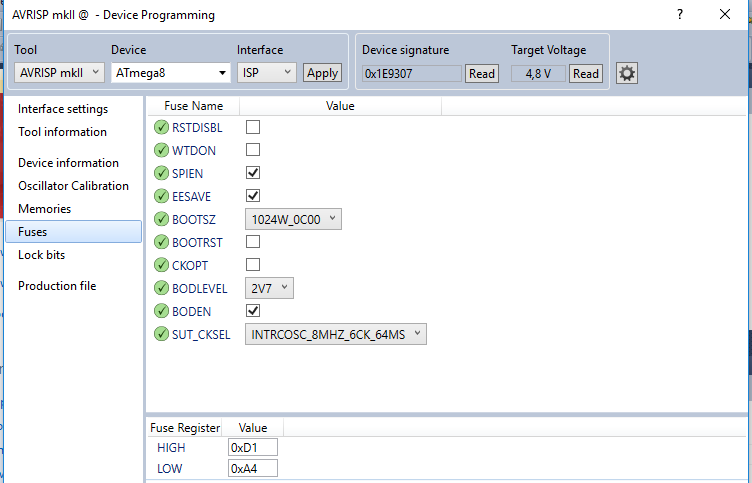 Chciałem zaprogramować Atmegę 8 do AVT5399 (2-kanałowy multimetr panelowy). Program dostępny jest w internecie. Zwróciłem się z prośbą do AVT by przesłali mi ustawienia fusebitów. Dostałem od nich ustawienia, ale kilka jest trochę inaczej niż w moim programie, w którym programuję. Pomógłby mi ktoś, które ustawienia pozaznaczać w mkAVRCalculator?