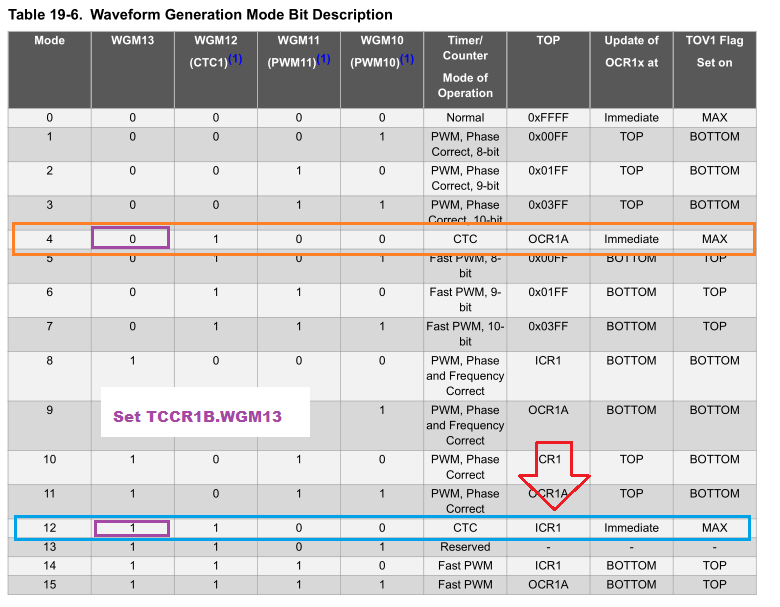 Zamysłem moim było generowanie na pinach OC1A i OC1B przebiegów konkretnej częstotliwości o wypełnieniu 50% nie PWM. Opisywanym smaczkiem jest to że ważne jest aby te przebiegi były identyczne (czytaj zgodne w fazie czyli jak na Jedym jedynka to na drugim też jedynka)