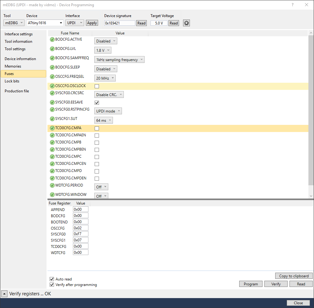 próbuję zrobić klon programatora/debuggera mEDBG ISP/dW + TPI + SWD + UPDI. Pierwsze próby z AS 7.0.1417 wypadły pomyślnie (można programować lub debuggować wszystkie mikrokontrolery posiadające w/w protokoły ), jednak podczas zabawy z ATtiny1616 i Atmel Start musiałem zaktualizować AS do 7.0.1645 i mam pewne problemy, za które odpowiedzialny jest zmodyfikowany wsad EEPROM. Dlatego właśnie chciałem prosić posiadaczy którejkolwiek wersji Xplained Mini o wsad EEPROM ATmegi32U4. Pomoże mi on w stworzeniu stabilnej wersji działającej z najnowszym AS.