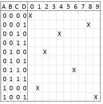 Tę tabelkę uzyskałem przez zaświecenie się diody, podłączonej anodą do zasilania, a na katodę podaję jedno z wyjść dekodera 74141. Schemat podłączenia diody: