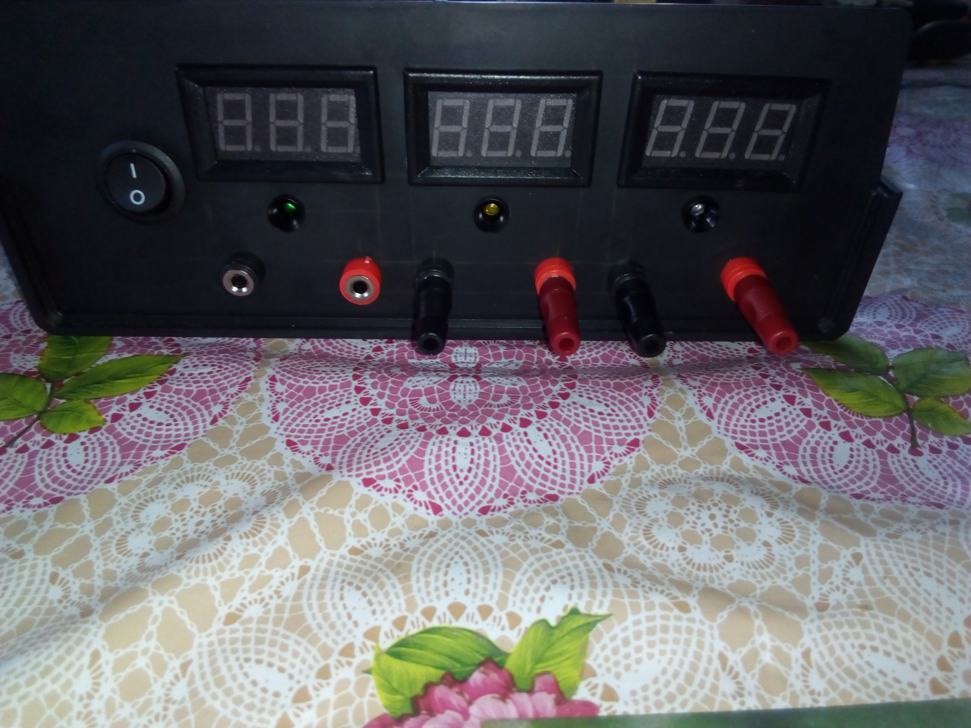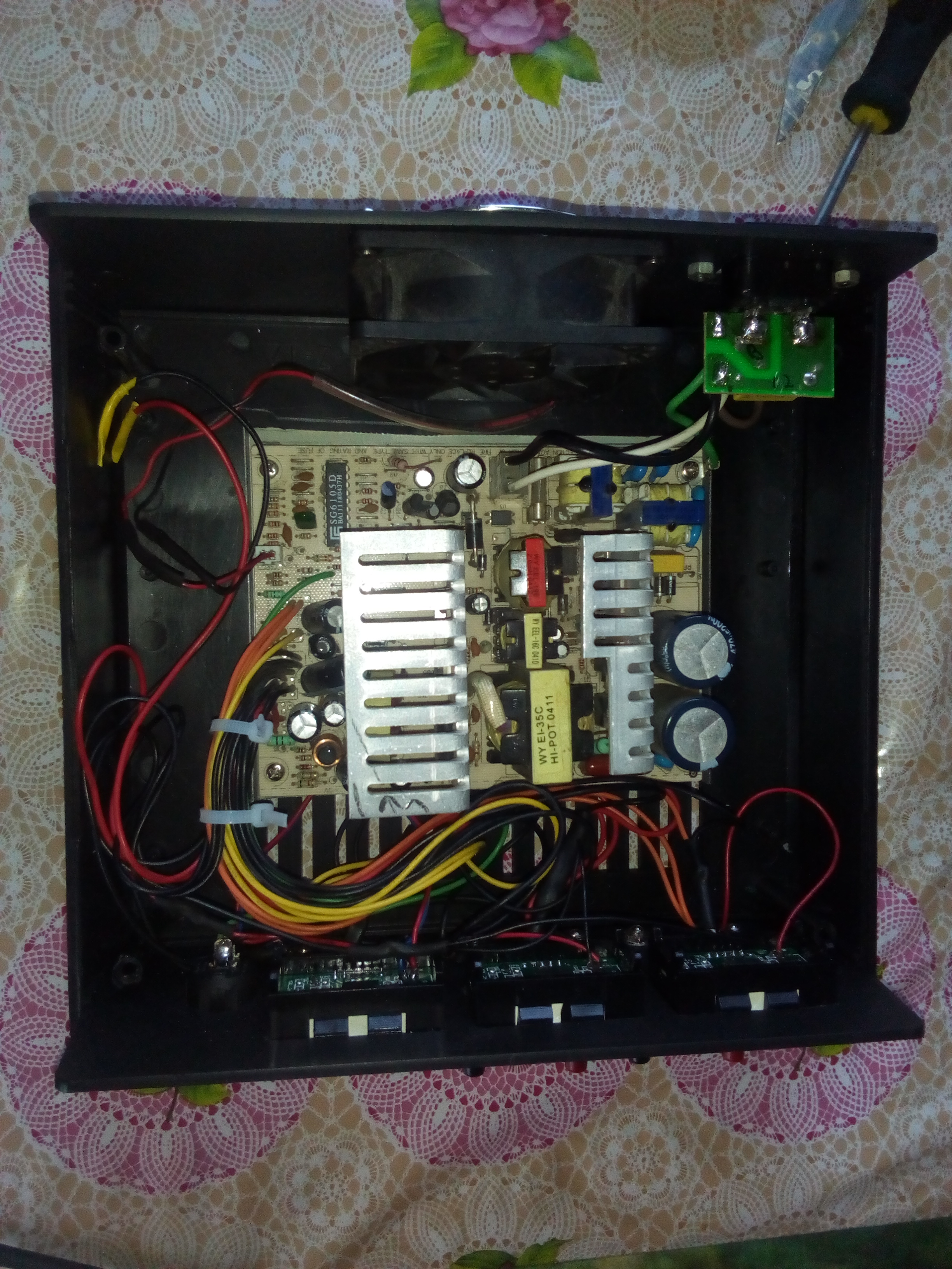 Wszystko się zaczęło od rozebrania zasilacza ATX, usunięciu nie potrzebnych kabli zrobienia dwóch włączników. Pierwszy - 230V, drugi wyłącznik wyzwalającego zasilacz (kabelki czarny i zielony), dodaniu LED z opornikami i tanich woltomierzy LED do monitorowania napięć, dodaniu gniazd bananowych.