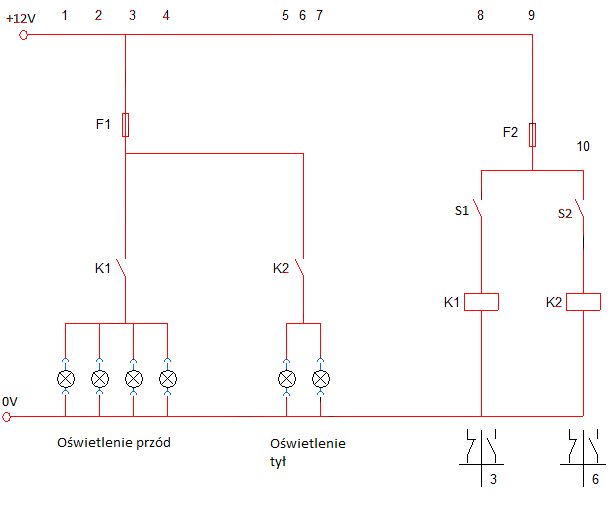 W załączeniu wrzucam zdjęcie tej instalacji. Kolorem czerwonym zaznaczone są przewody 2,5mm2 a niebieskim 0,75mm2 (fabrycznie wypuszczone z lamp). Instalacja zaczęła się palić przy bezpieczniku F1 i cały się stopił. F1=15A (rurkowy). Lampy mają po 27W każda. Napięcie akumulatora 12V. Proszę o opinie co może być błędnie zrobione bo ja już nie mam pomysłu.