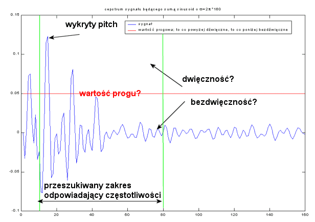 I tutaj niestety mam problem z wyznaczeniem czy dany fragment sygnału jest dźwięczny/bezdźwięczny. Przekopałem dużą ilość materiałów na sieci i jedyne co znalazłem, to informacja, że sygnał jest dźwięczny gdy pitch przekroczy próg 0.85. Nie jestem pewien co to oznacza - w moim przypadku sygnał testowy NIGDY nie osiąga tak dużej wartości pitch - metoda autokorelacji natomiast wyznacza dosyć poprawnie dźwięczność/bezdźwięczność. Również odniesienie do składowej w punkcie zero nie daje zadowalających efektów. Byłbym wdzięczny za pomoc bądź wskazanie jakiegoś źródła które by to wyjaśniło.