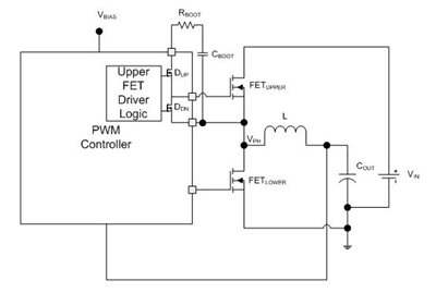 Na rysunku 1 przedstawiono 'górną' część synchronicznej przetwornicy typu buck z jej kluczem i sterownikiem bramki. Do załączenia tranzystora FETUPPER potrzebny jest pewien ładunek, który pochodzi z kondensatora oznaczonego na rysunku CBOOT. Kondensator ten ładowany jest przez opornik RBOOT z wykorzystaniem górnego tranzystora (MOSFET typu P) w sterowniku.