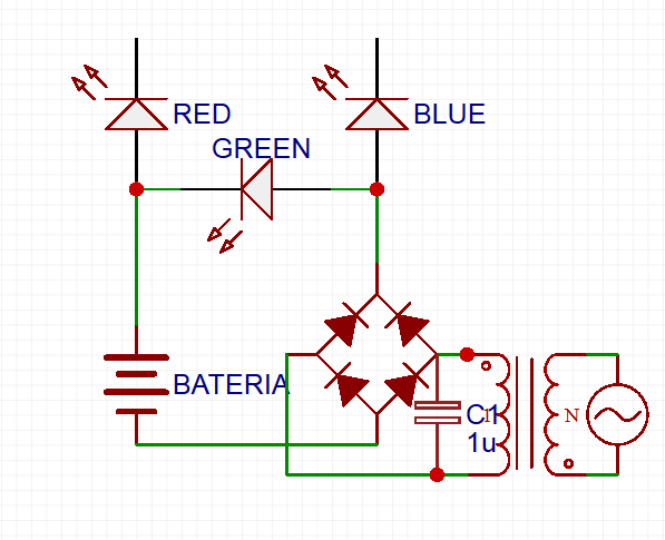 Chcę zrobić swego rodzaju UPS w którym podczas ładowania świeciłaby się dioda zielona, podczas wykorzystywania napięcia prądnicy niebieska, a przy rozładowywaniu baterii czerwona. Moim problemem jest to, że nie mam pomysłu jaki układ zrobić, aby podczas działania prądnicy odłączało obwód z czerwoną diodą. Nie pytajcie mnie o zastosowanie, wymaganą moc itd. ponieważ układ ma być tylko i wyłącznie w celach testu, a obciążeniem będą tylko diody. W załączniku dodaję schemat jak to mniej więcej by wyglądało.