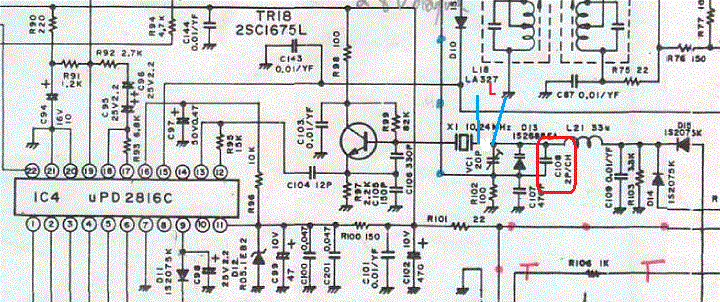 Radio zakupiłem jakiś czas temu już przestrojone. Został wstawiony dławik indukcyjny o wartości 6,8µH w szereg z rezonatorem X1 10.240 MHz. Efekt jest taki, że częstotliwość na wszystkich kanałach i na wszystkich czterdziestkach, jest przesunięta o 1,5 KHz w górę od zer. Regulacja trymerem VC1, powoduje zmianę częstotliwości, jedynie o kilka Hz.