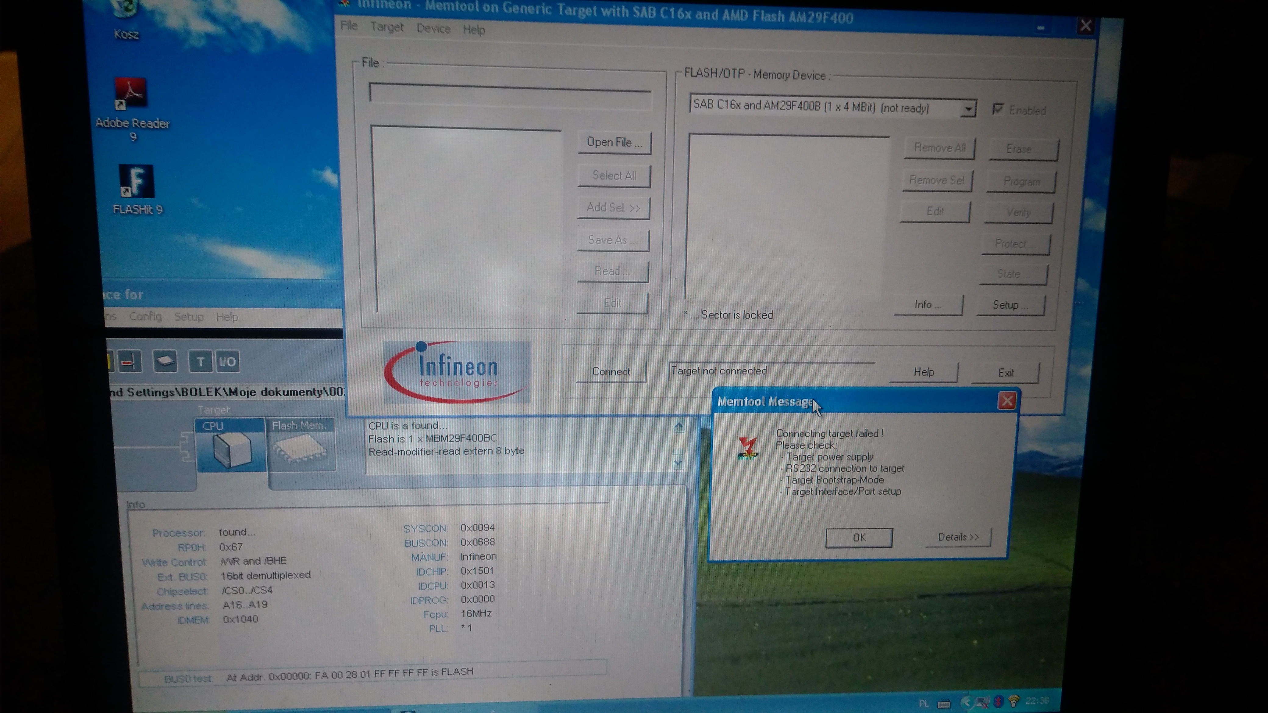 I w tej chwili monitor programu wykrywa procesor, ale ST10F167 - jednak brak info i dostępu do pamięci zewnętrznej (możliwe to, że wykryty nieprawidłowy procesor blokuje ten dostęp ??).