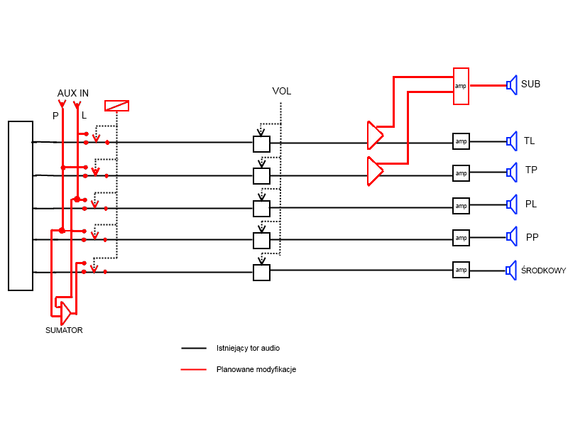 Mam w samochodzie fabrycznie zewnętrzny wzmacniacz 5.1. Niestety nie mam AUX in oraz wyjścia na subwoofer - nie ma też prostej możliwości dołożenia tych elementów więc chcę zmodyfikować wzmacniacz. We wzmacniaczu poza dekoderem cyfrowym są cyfrowe potencjometry do regulacji głośności i osobne końcówki mocy na każdy kanał (jak na rysunku poniżej - kolor czarny). Planuję dołożyć przekaźniki, które będą rozpinały tor i wprowadzały sygnał z zewnętrznego urządzenia. Dodatkowo chciałbym wyprowadzić sygnał z przed końcówek mocy na subwoofer. Niestety nie da się tego wprost zrobić, ponieważ wtedy tylne głośniki ciszej grają.