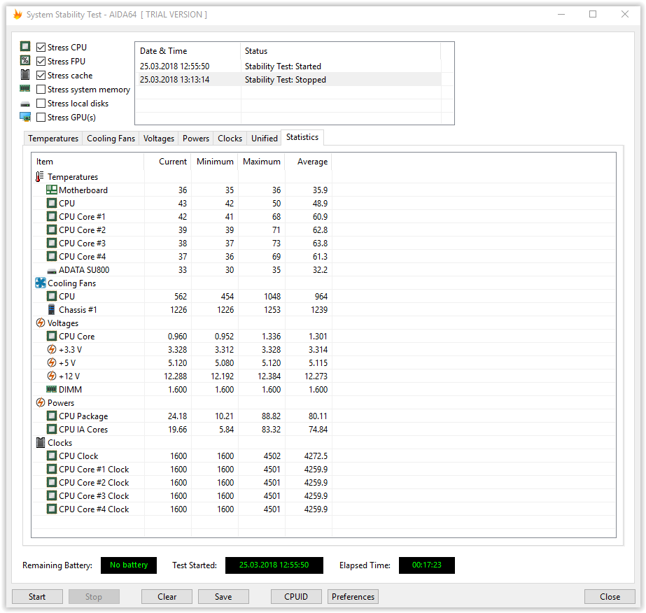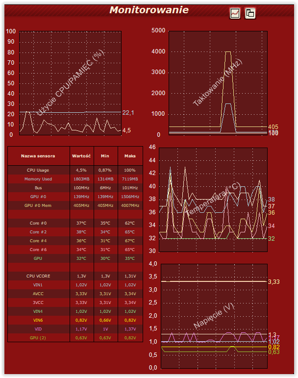 Wykonałem test stabilności procesora programem AIDA 64 Extreme, screena zrobiłem, gdy procesor osiągnął najwyższe napięcie, zwykle zatrzymuje się w okolicy 1.432 V.