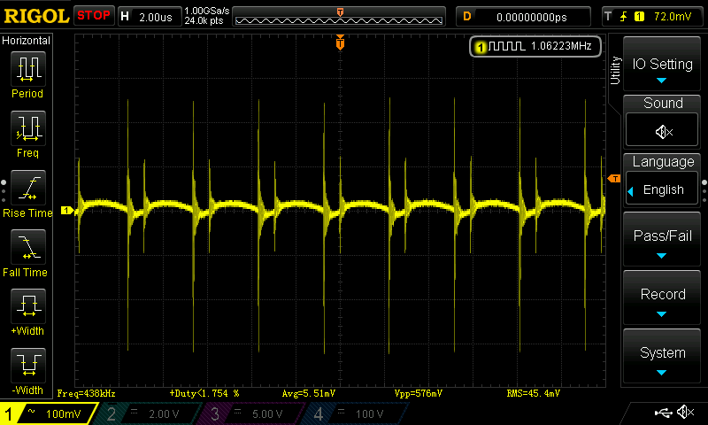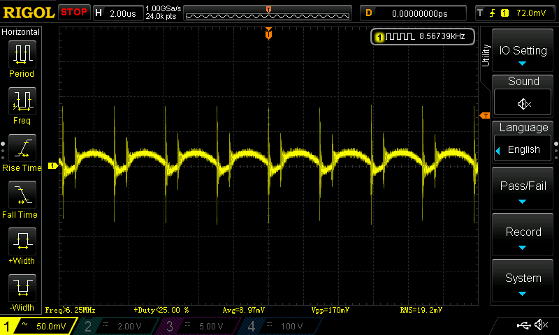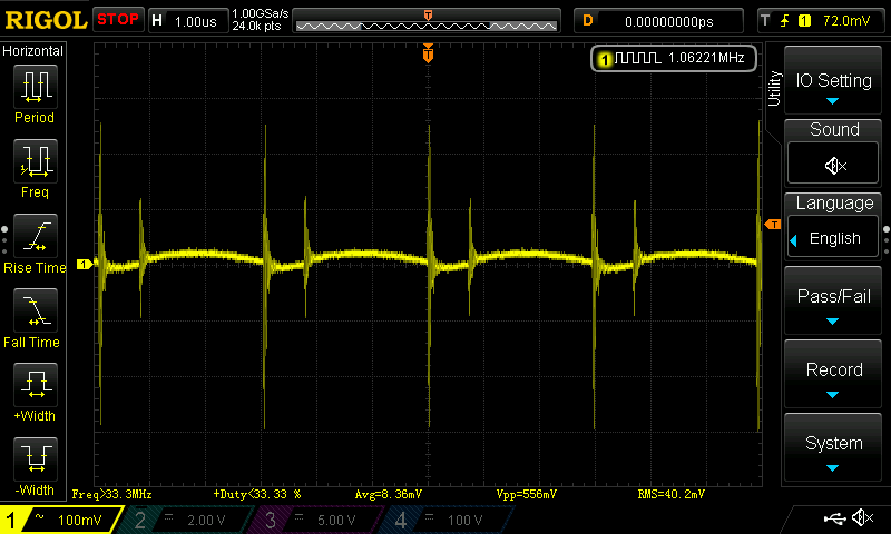 Spore zaskoczenie, ~0.5Vpp zamiast ~1.5Vpp, zniknęły dziwne oscylacje jednak nadal obecne są spore szpilki.