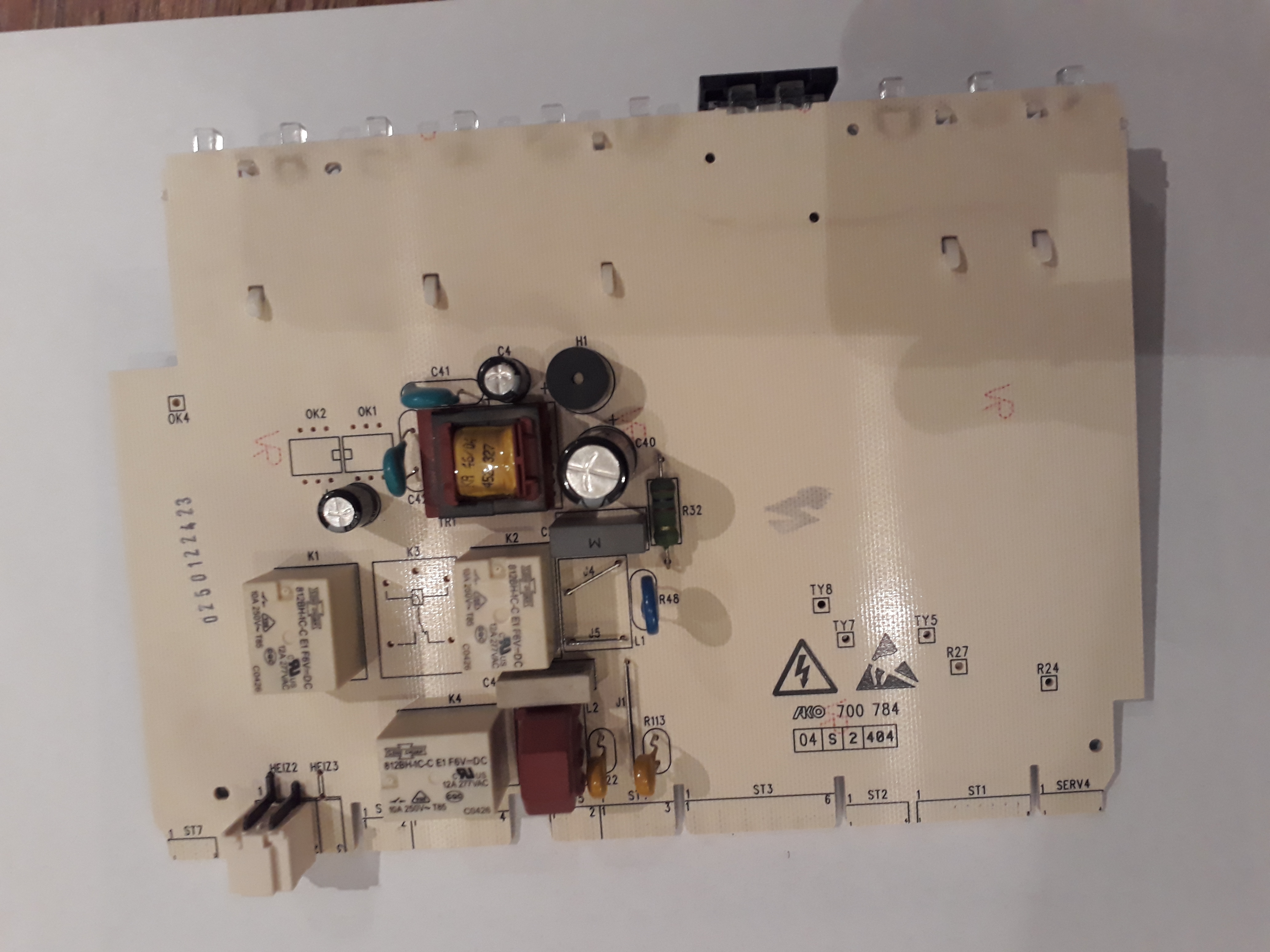 W zmywarce doszło do zwarcia z powodu rozszczelnienia pompy. Wymieniłem pompę niestety przy ponownym włączeniu zasilania zmywarka nie włącza się. Sprawdziłem wyłącznik na drzwiach, napięcie dochodzi i wychodzi po przełączeniu niestety najprawdopodobniej nie dochodzi do sterownika (o ile dobrze zlokalizowałem wtyczkę zasilająca, w załączeniu zdjęcie z zaznaczeniem, gdzie mierzyłem). Czy można uzyskać schemat tej zmywarki?