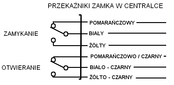 Sześć przewodów od prawej strony to sterowanie zamkiem. Przykładowe podłączenia na rysunku: