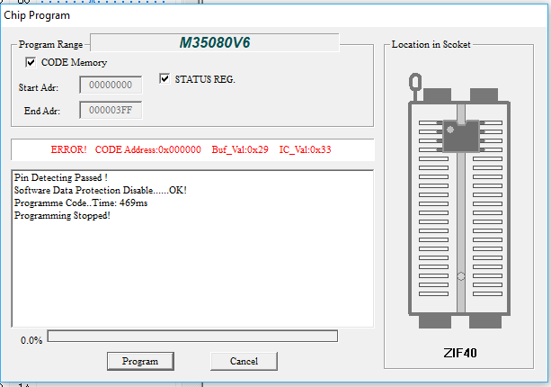 Soft jaki dostałem, to Xgpro v 8.08. Po wpisaniu typu pamięci M35080 i wybraniu M35080-6 SOIC8 (bądź innych) za każdym razem dostaję błąd połączenia pinów.
