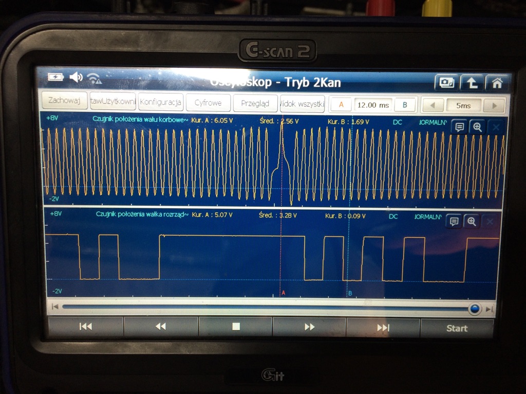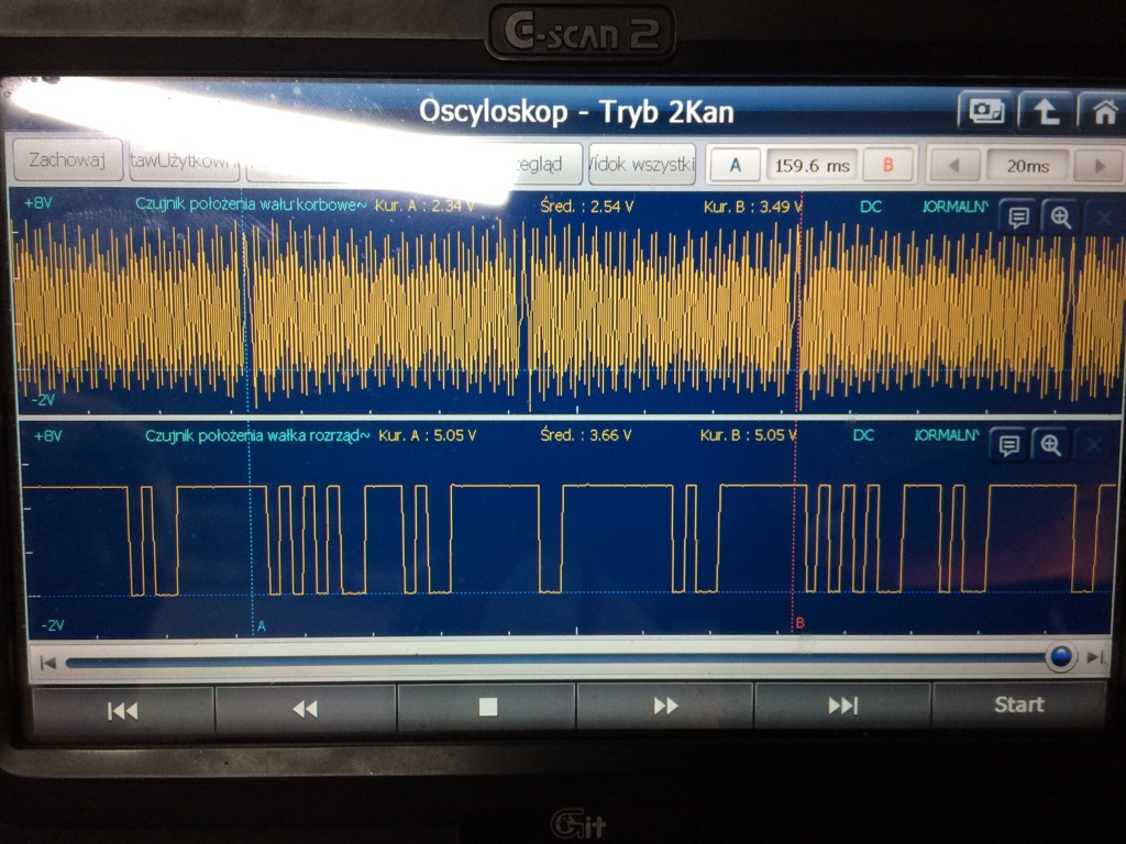 Witam. W moim scenicu 1.4TCE został wymieniony silnik ( słupek po regeneracji). Po wymianie mam problem ponieważ na wyświetlaczu pojawia się błąd "skontroluj układ wtrysku paliwa" i " skontroluj układ wydechowy". Samochod nie zawsze odpala więc został podłączony pod komputer w celu ustalenia przyczyn awarii. Mechanik sprawdził ponownie wszystkie połączenia, zamienił także czujnik na inny , dalej to samo. Komputer pokazał błąd P0341. Mechanik podłączył pod oscyloskop czujniki. W załączniku są przebiegi z oscyloskopu. Z tego co widzę wydaje mi się ( tak także sądzi mechanik) że miedzy czujnikami nie ma synchronizacji. Czy ktoś ma przebiegi że swojego auta w celu porównania. Będę wdzięczny za wszelkie informacje. W samochód już wladowalem 16tys i dalej nie mam czym jeździć. Pozdrawiam
