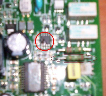 na fotce czerwonym kolkie zaznaczylem ten tajemniczy uklad, bo jak widac jest uszkodzony, i odczytac nie mozna co to jest za cudo. Zaznaczylem tez opornik, choc z nim problemu nie bedzie