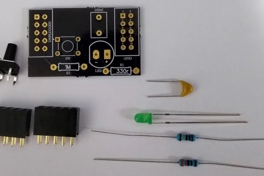 Lutujemy elementy zgodnie z opisem na płytce drukowanej i przycinamy wystające nóżki elementów. Złącze opisane UNPLUGGED nie jest elektrycznie połączone z układem, ma za zadanie jedynie zapewnić mechaniczne podparcie płytce na Raspberry Pi. Jeśli na procesorze naszego komputera zamontowaliśmy radiator, to nie montujmy tego złącza, a płytkę drukowaną podklejmy od spodu kawałkiem taśmy izolacyjnej.