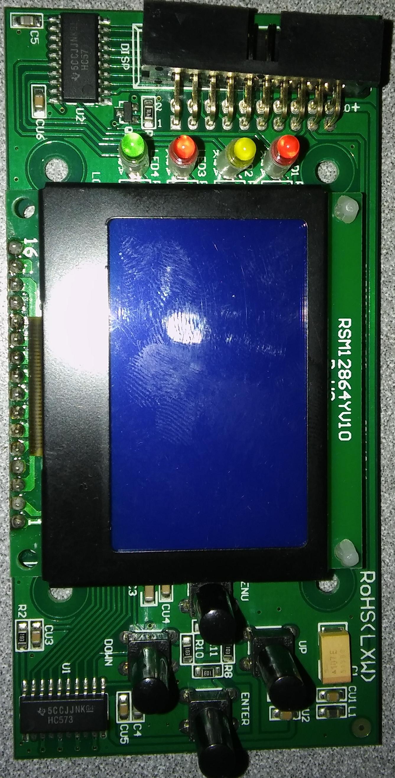 Wyświetlacz jest graficzny, prawdopodobnie 128x64, niebieskie tło, wyświetla na biało.