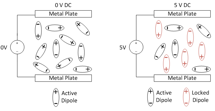 Przyłożenie zewnętrznego napięcia DC do kondensatora wytwarza stałe pole elektryczne, które redukuje początkową polaryzację, a następnie "blokuje" lub polaryzuje resztę aktywnych dipoli na swoim miejscu. Polaryzacja jest związana z kierunkiem pola elektrycznego w dielektryku. Powoduje to redukcję efektywnej pojemności tego elementu