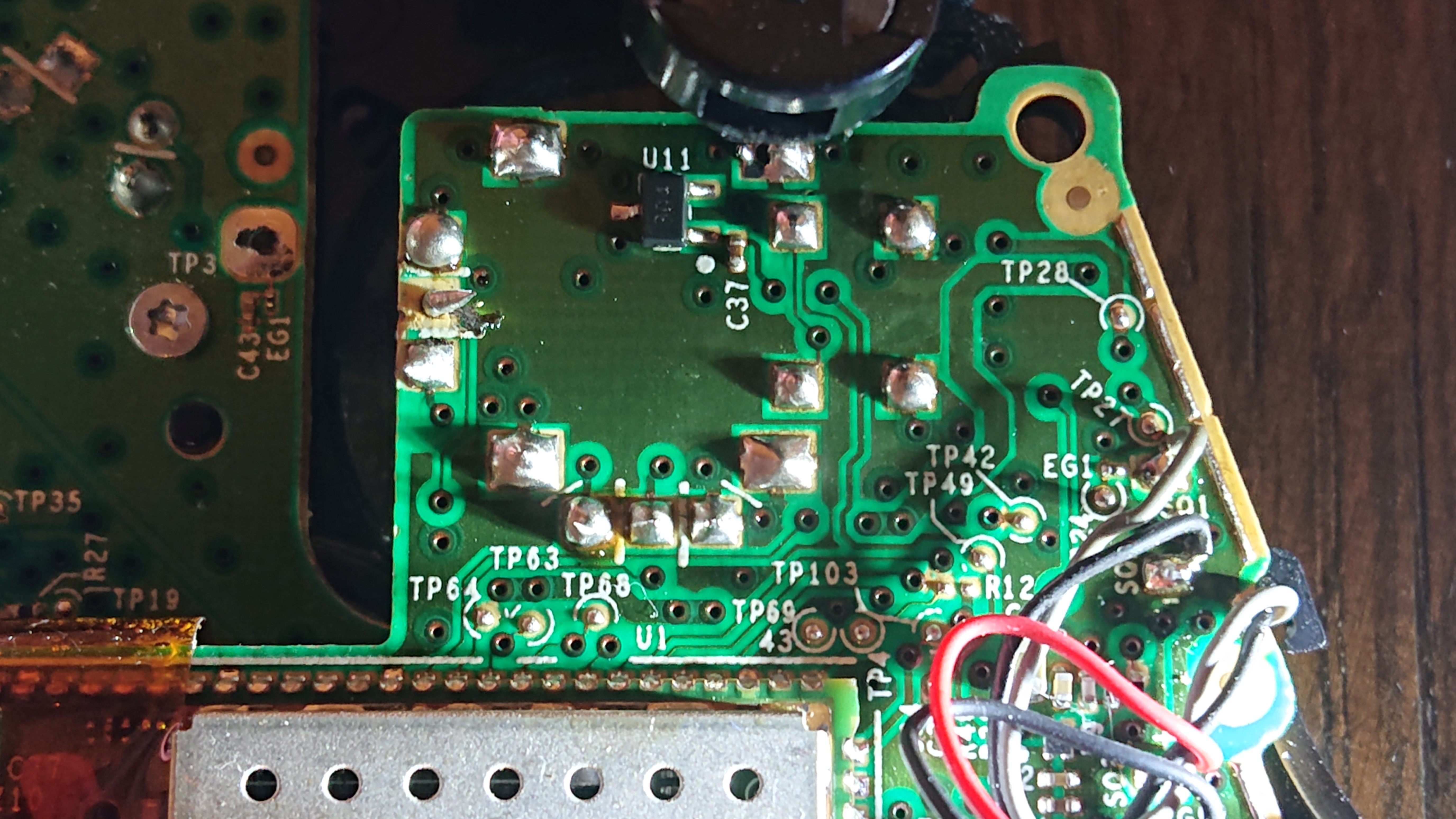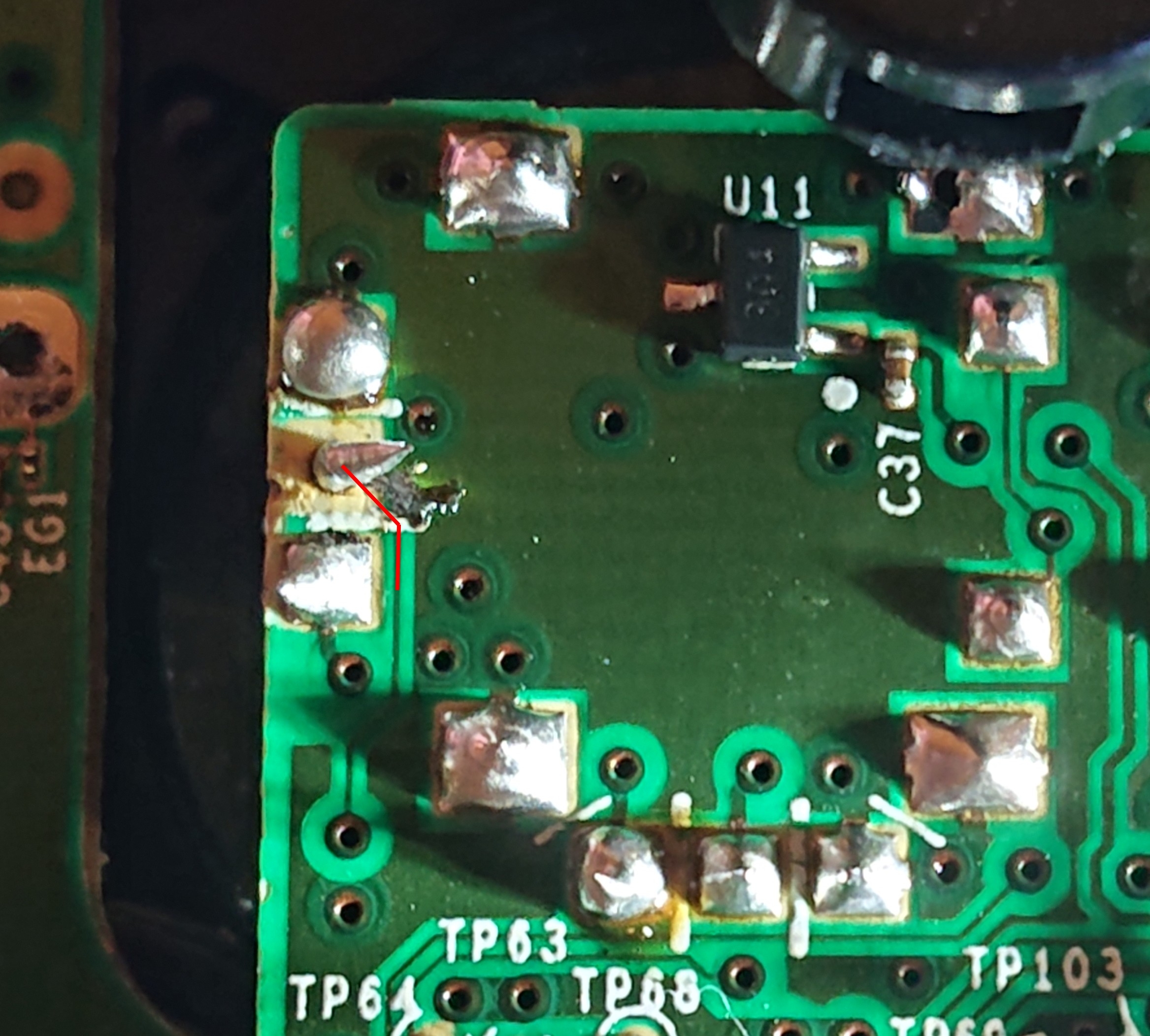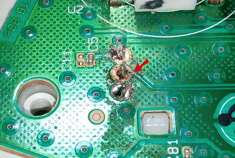 . Załączam 2 zdjęcie, kółkiem zaznaczyłem pin który nie ma styku z płytką. Płytka zapaćkana jest kalafonią, więc proszę bez zbędnych komentarzy typu że co to za robota albo kup nowego pada.