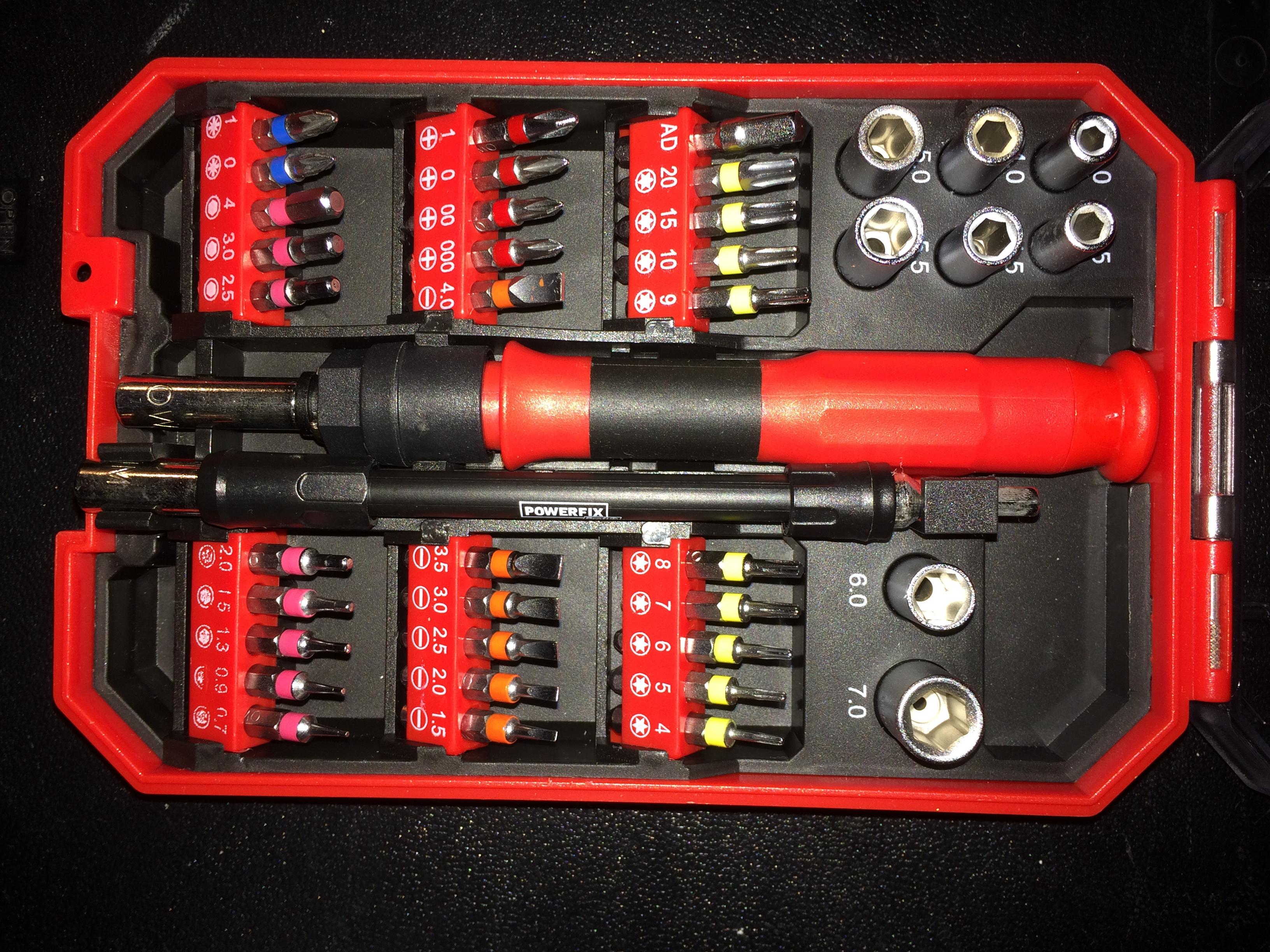 W zestawie POWERFIX znajdziemy oczywiście wkrętak, 30 bitów, są to podstawowe rozmiary: płaski, krzyżak, torx oraz imbusy. Niestety brak wśród bitów końcówek typu "U", trójkąta, także minus za to że torxy są w wersji podstawowej a nie z otworem (torx securit). Dodatkowo otrzymujemy przedłużkę elastyczną (jeszcze nigdy z niej nie korzystałem), szkło powiększające oraz obcinaczki (które raczej nadają się tylko do "lekkich" prac:). Całość umieszczona dość poręcznie w plastikowym pudełku.
