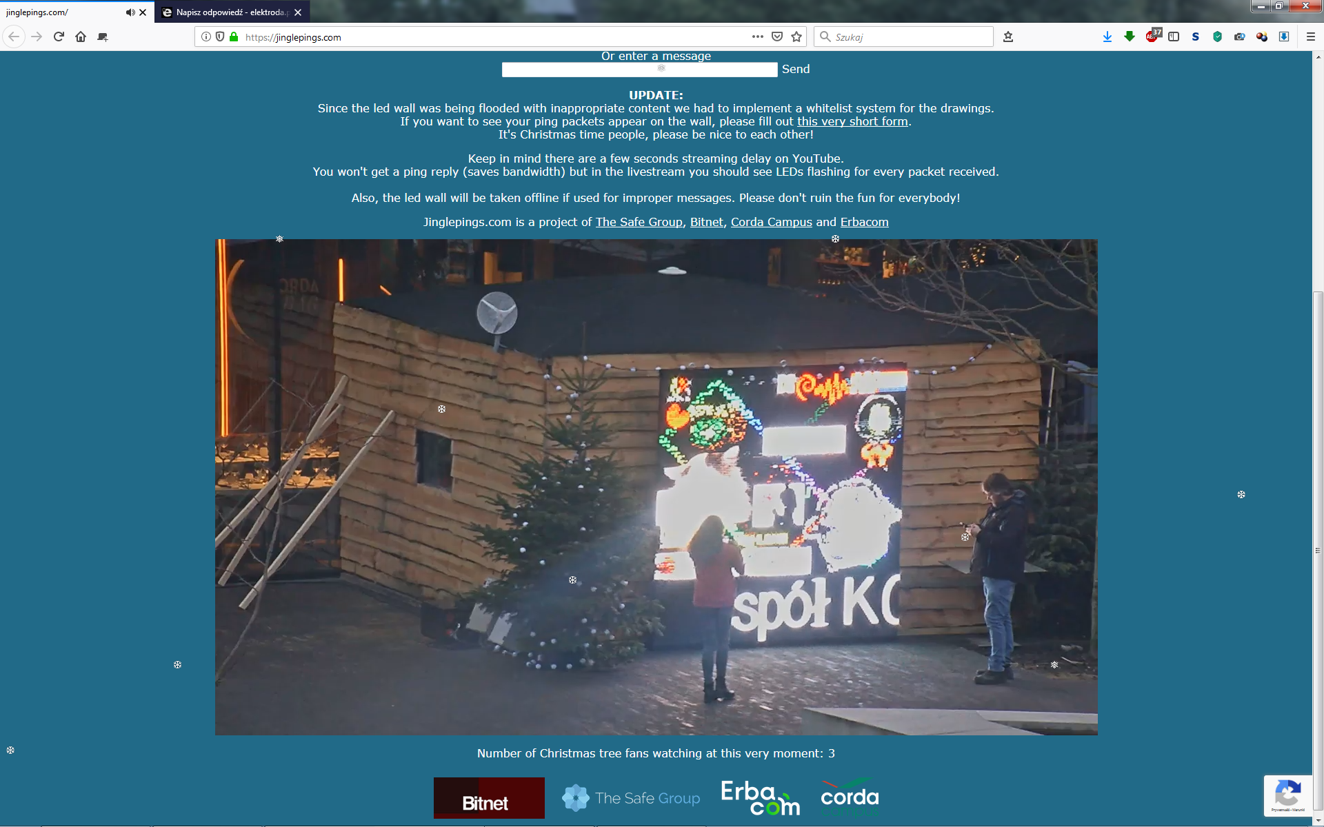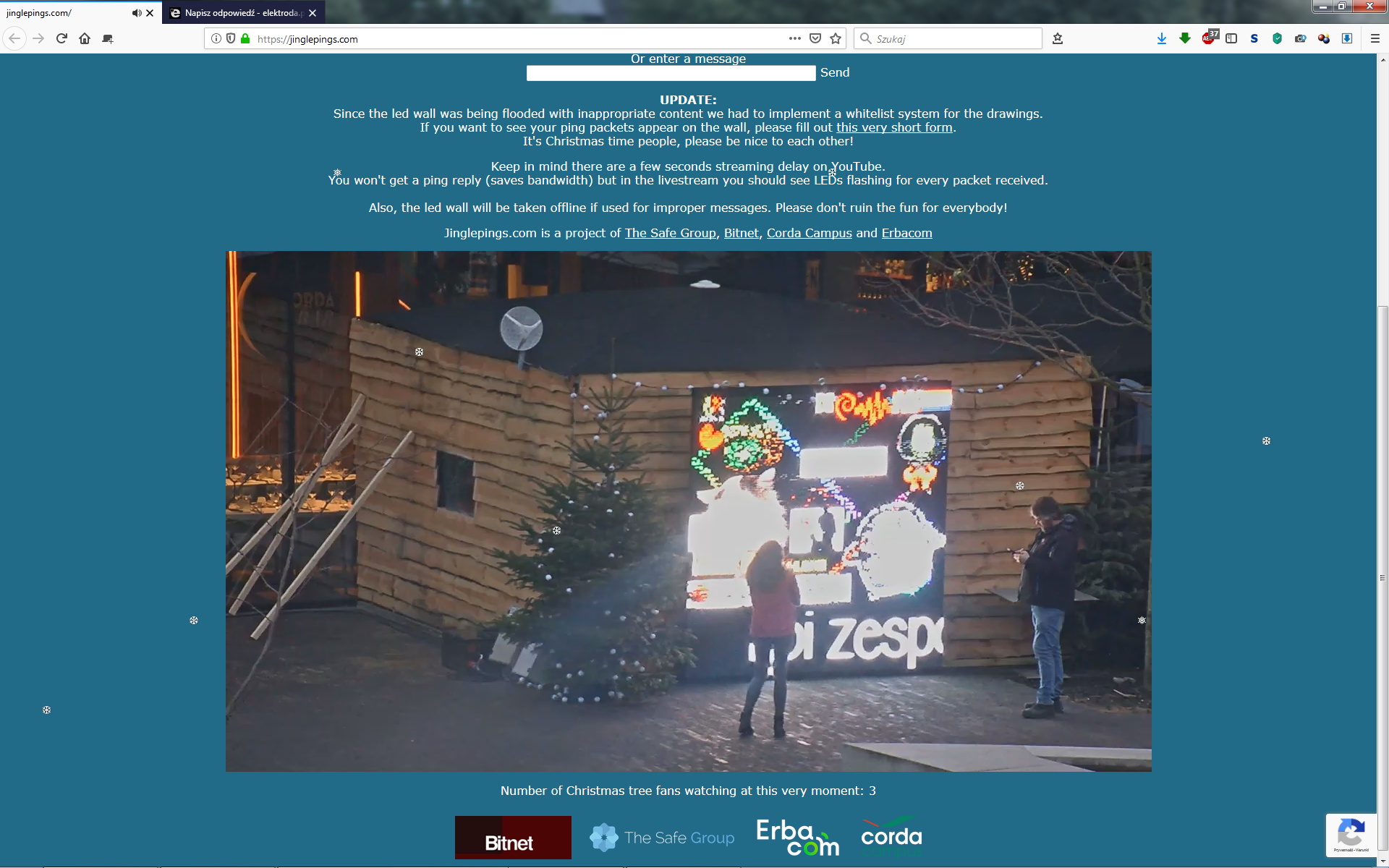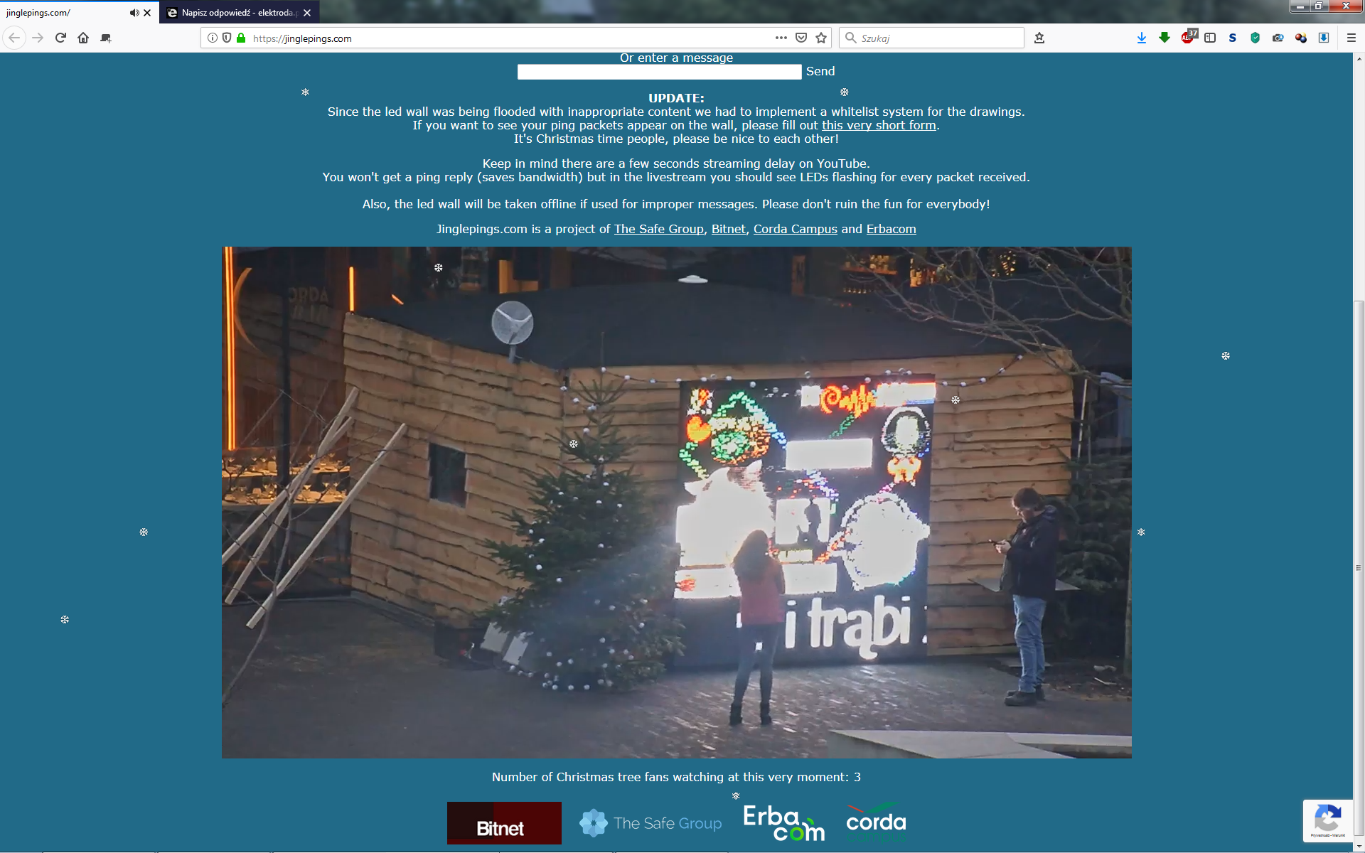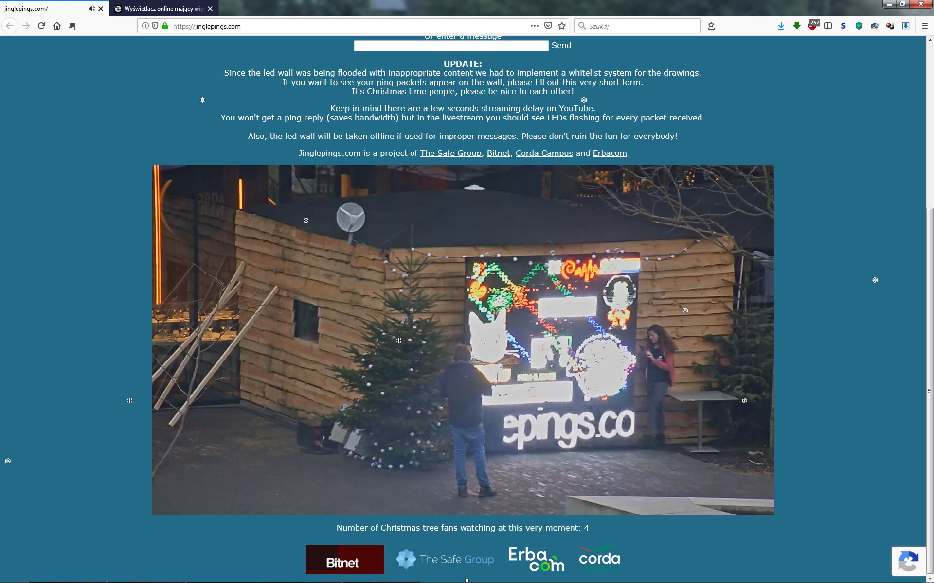 Ponieważ na wyświetlaczu zaczęły pojawiać się niezbyt świąteczne treści, autorzy projektu wprowadzili krótki formularz dla chcących pingować wyświetlacz https://jinglepings.com/requestaccess.php który wprowadza źródłowy adres IPv6 na białą listę. Jeżeli posiadacie komputer z adresem IPv6 lub możecie zestawić tunel 6to4 możecie spróbować swoich sił w rysowaniu pingami na wyświetlaczu LED.