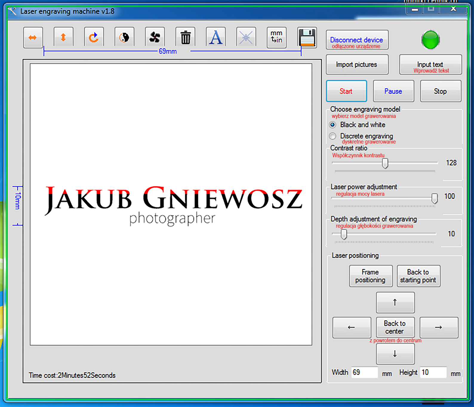 Niestety nacieszyłem się nią przez krótką chwilę... Pierwsza próba udana, grawerka elegancko wypaliła logo przy fabrycznym ustawieniu głębokości 10. Dla sprawdzenia jak głęboko może wejść w materiał podkręciłem ją na maxa czyli 100 i po godz eleganckiego wypalania zaczęła jedynie nakreślać ruch. Ponownie włączyłem ją po 3 h jednak to samo, tylko ruch lasera. Możliwe że coś spaliłem? Podrzucam wideo oraz .jpg na program do maszynki.