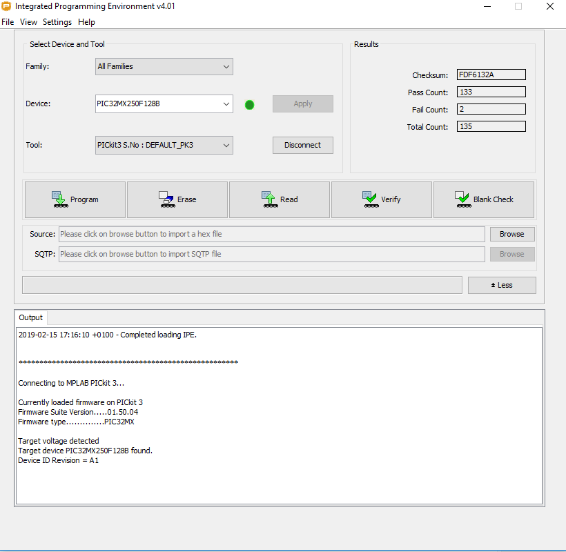 I ostatecznie wgrałem wsad z pomocą PICKIT3 oraz MPLAB IPE v4.01:
