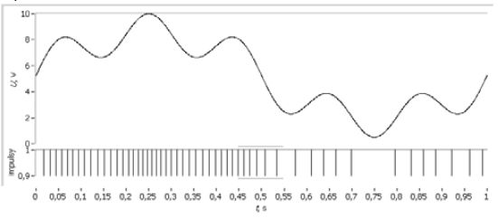 Wizualizacja zmian częstotliwości sygnału w postaci wykresów na osi czasu. Zasada przedstawiona na rysunku.
