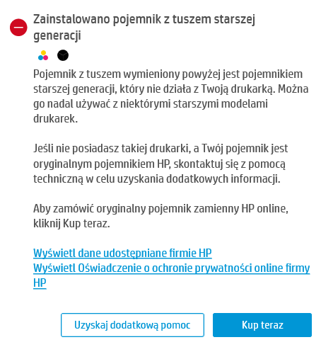 Zamówiłem więc tusze firmy ActiveJet również o nr 304 (kolorowy i czarny) w pojemnikach od 304 XL. Niestety ale po włożeniu tuszy do drukarki (oczywiście odklejając tasiemkę zabezpieczającą), wyskoczyło powiadomienie o zainstalowaniu pojemnika z tuszem starszej generacji, a na drukarce nie można wydrukować nic. (Załączam screen'a z powiadomieniem oraz ze zdjęciami tuszy).
