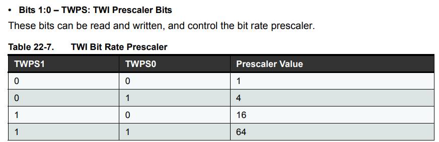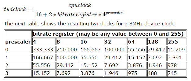 TWBR = ((F_cpu / F_scl) - 16) / (2 * 4^1) = ((8000000 / 100000) - 16) / (2 * 4) = 8