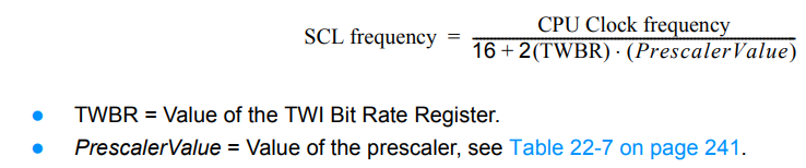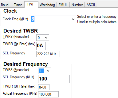 TWBR = ((F_cpu / F_scl) - 16) / (2 * 1) = ((8000000 / 100000) - 16) / (2 * 1) = 32
