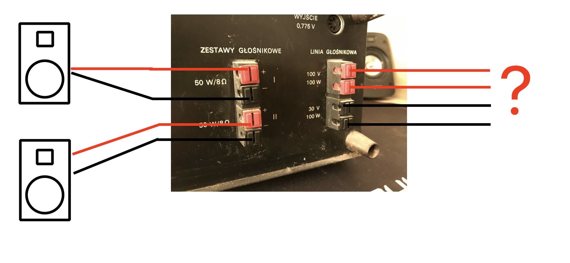 Teraz tak; są tu 4 złącza do zestawu głośnikowego 50w 8ohm, a obok