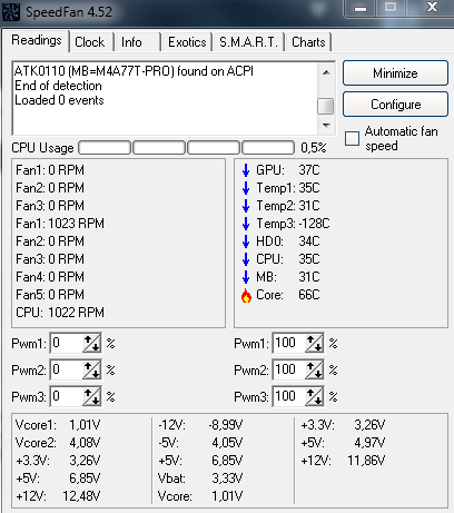 Jedyne czego nie moge zrobić to zmniejszyc napięć, próbowalem znaleść gdzieś online i samemu ale bez skutku, jedynie co widze to info ile mam. Ostatnio sie nad tym zastanawiałem, bo ogólnie to rdzenie sa cieplejsze od samego CPU ale by az tak bardzo nawet w spoczynku? Zrobiłem screena też w SpeedFan i tam CPU wynosi 35 st.C a rdzenie po 66 st.C
