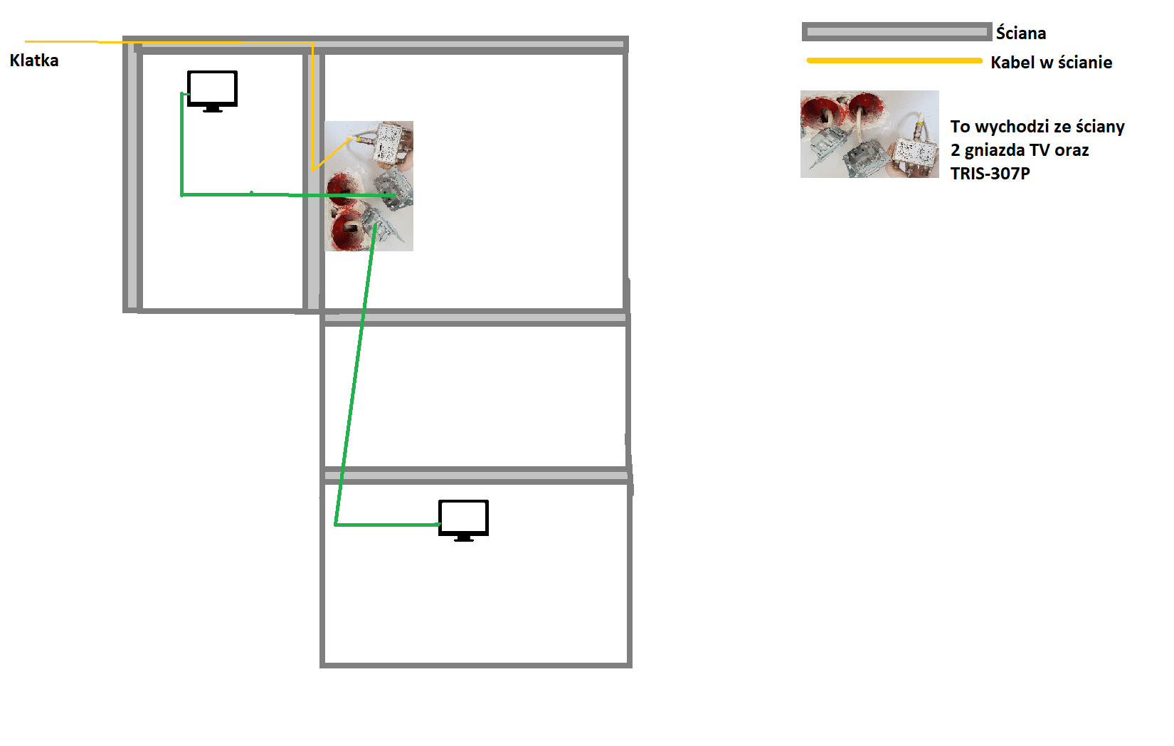 Obecną infrastruktura jest oznaczona kolorem pomarańczowym. Kabel idzie w podłodze do największego pokoju i tam jest skrzynka UPC, a w środku rozdzielacz tris-307p. Obok są dwa gniazda z napisem tv, ale nie wiem czy one są podłączone, oznaczone kolorem brązowym. Czy mogę przeciąć pomarańczowy przewód i pomiędzy włożyć 2 way splitter? Rozdzielenie byłoby wtedy jeszcze przed skrzynką upc( z podziałem na data i rtv).