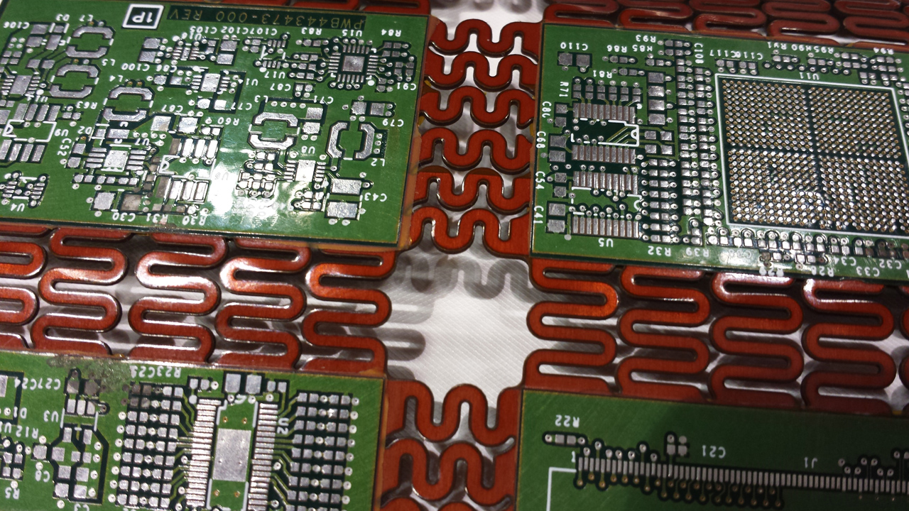 Na zdjęciu powyżej widzimy płytki z ośmioma warstwami elastycznego laminatu i dodatkowymi czterema sztywnymi warstwami PCB. Warto zwrócić uwagę na to, że wierzchnia warstwa laminatu flex jest w pełni zalana miedzią – jednolita wylewka pełni tutaj rolę ekranu dla sygnałów znajdujących się wewnątrz. Dodatkowo, warto zwrócić uwagę na miejsce styku sztywnych PCB z elastycznym laminatem i zastosowane tam dodatkowe wzmocnienia.
