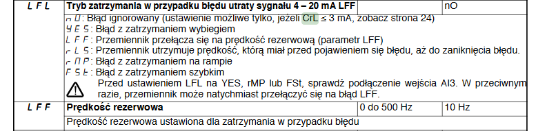Mam problem, gdyż chcę sterować prędkością silnika poprzez zadanie wartości z wejścia AI3. Jak mam ustawione wartości CrL3=4mA i CrH3=20mA to wszystko ładnie śmiga. Natomiast ja potrzebuję odwróconego sterowania CrL3=20mA a CrH3=4mA <- tylko po zmianie tych parametrów wywala mi od razu błąd LFF.
