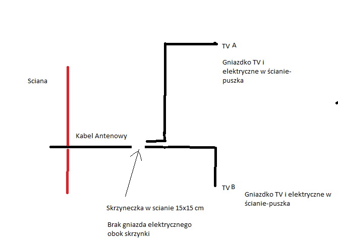 Witam. Mam problem z instalacją antenową w bloku, majster włożył w ściany kabel tv który docelowo ma obsługiwać kablówkę z Vectry i tu rodzi się moje pytanie-czy to będzie grać jak należy. Dodałem schemat przedstawiający całą sytuację z kablami-czy jest możliwość w takim układzie w pokoju z TV A podłączyć z gniazdka splitter, a z niego TV i ruter internetowy tak żeby TV B też normalnie grał czy to sie raczej wyklucza? W skrzynce Zamontowałbym zwykły rozdzielacz antenowy-brak gniazdka elektrycznego by wyprowadzić tam ruter. Co o tym myślicie? Jak byście to usprawnili żeby miało to ręce i nogi już bez kucia w ścianach i zbędnych kabli walających się po mieszkaniu.