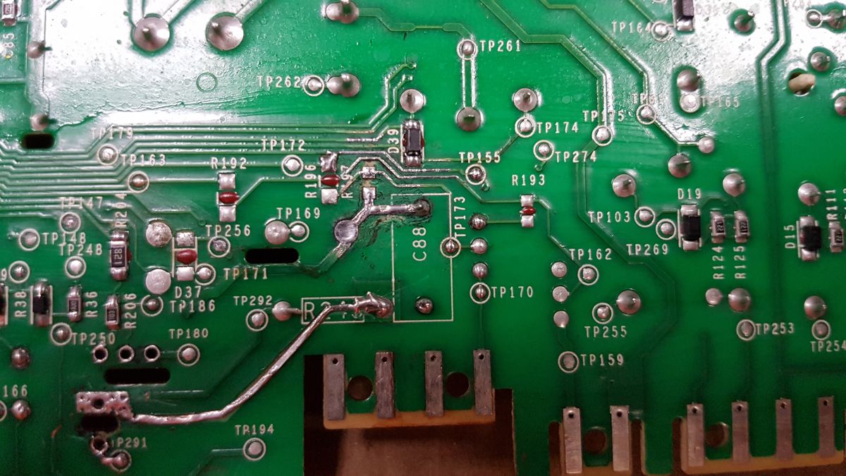 Uszkodzony mostek 1A, triak ACS108-08SA oraz drobnica 2 rezystory 820Ω oraz dioda. Poza tym są dwa miejsca, które były dość skorodowane i nie wiem czy tam coś powinno być czy puste? Rezystor R197 oraz JP2 (obok wylutowanego Q32). Jak kto ma pod ręką taką płytę to proszę o podpowiedź.