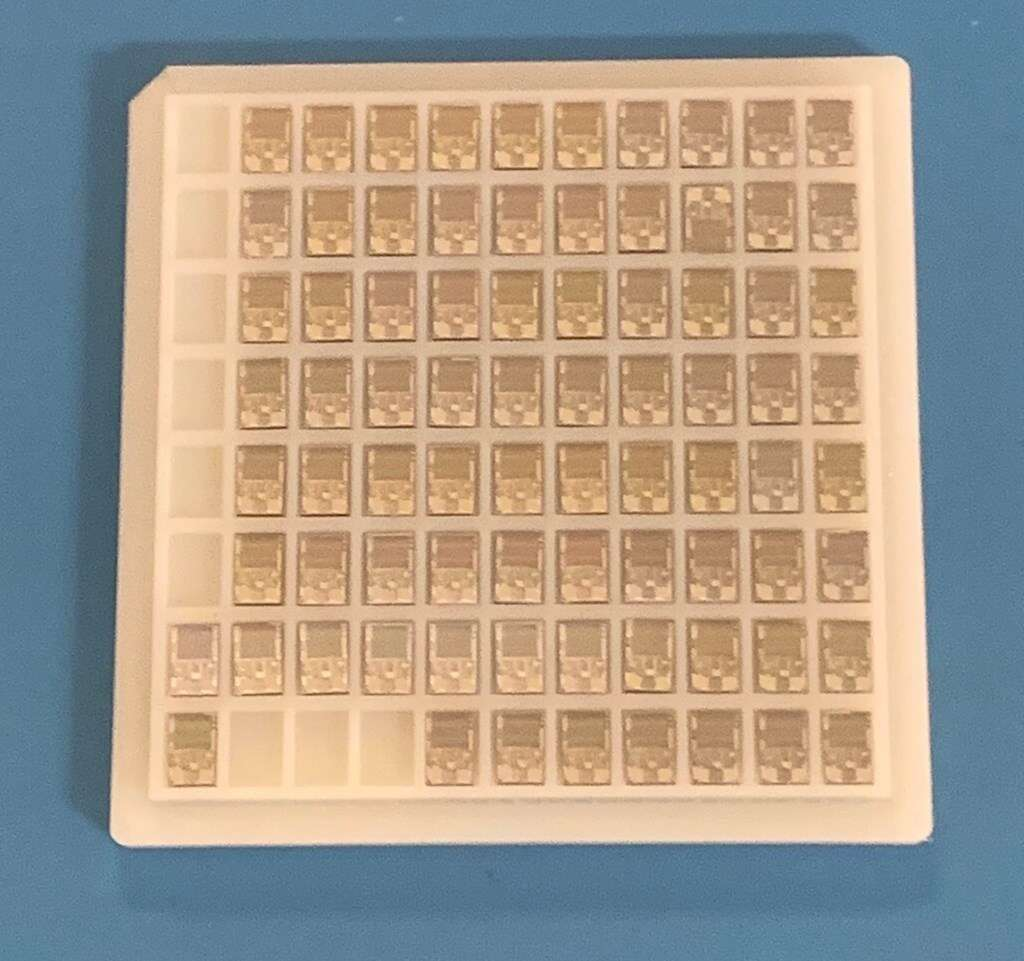 Układy są zazwyczaj dostarczane w taśmie, na tacce. Tacka, taka jak pokazana powyżej, po lewej stronie, zawiera w sobie wiele elementów – są to już pocięte fragmenty przetworzonego wafla krzemowego, na którym wytworzono układy półprzewodnikowe. Klasycznie, tego rodzaju elementy, byłyby zalewane w obudowie układu scalonego.