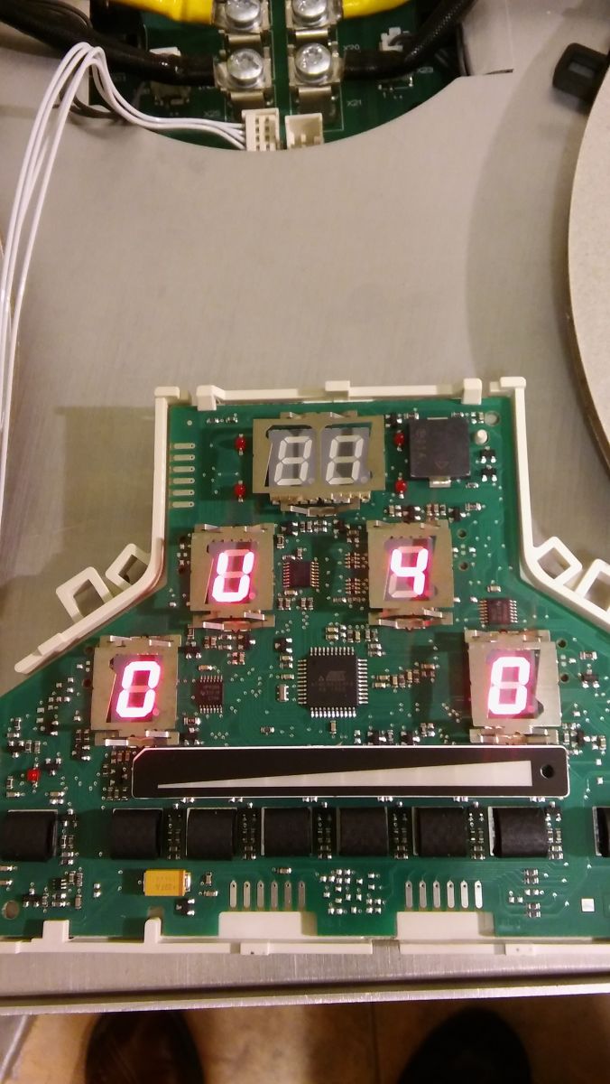 Witam. Płyta indukcyjna jak w temacie. Była uszkodzona przetwornica ICE3A1065 i pare innych elementów zw zasilaczu napięć pomocniczych. Po naprawie załącza wszystkie wyświetlacze i diody na panelu sterującym wyłącza je i sygnalizuje buzzerem stały sygnał dźwiękowy, oraz miga pokazanymi na dołączonym zdjęciu wyświetlaczami. Można odczytać jakby U4 , ale to przecież chyba nie jest kod błędu.