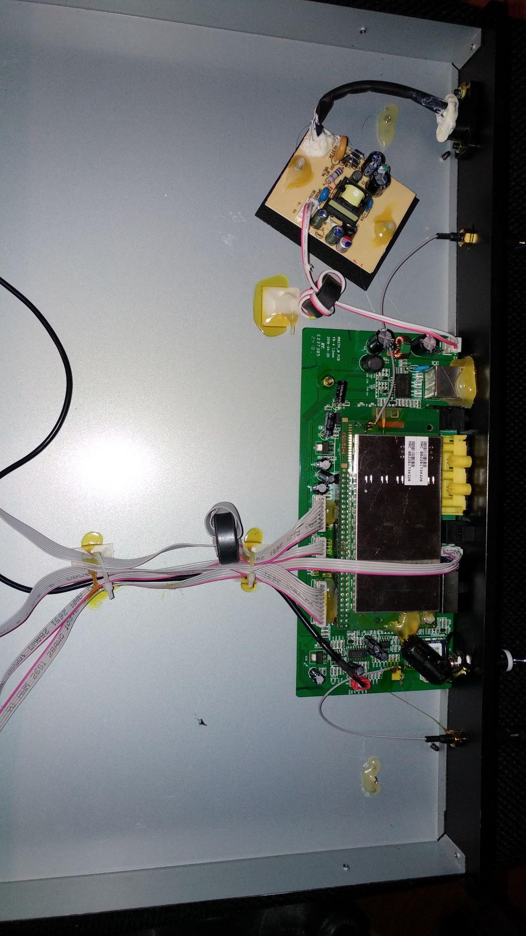 Brzegi blach wewnątrz (ostrzeżenie dla serwisantów) są ostre i trzeba uważać, podstawowym składnikiem masy sprzętu (żeby klient wiedział za co płaci) jest klej na ciepło, który w moim mniemaniu ma zabezpieczyć wypadnięcie wtyczki z gniazda, albo urwanie przewodu wymierzonego co do milimetra, albo być potwierdzeniem KJ w kitajskiej fabryce.