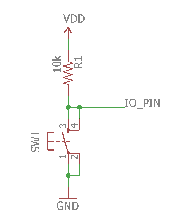 To jest przycisk z rezystorem pull-up. Pin IO mikrokontrolera podciągnięty jest do zasilania i ma domyślnie stan logiczne 1. Dopiero w momencie wciśnięcia przycisku jest zwierany do masy i przechodzi w stan 0.