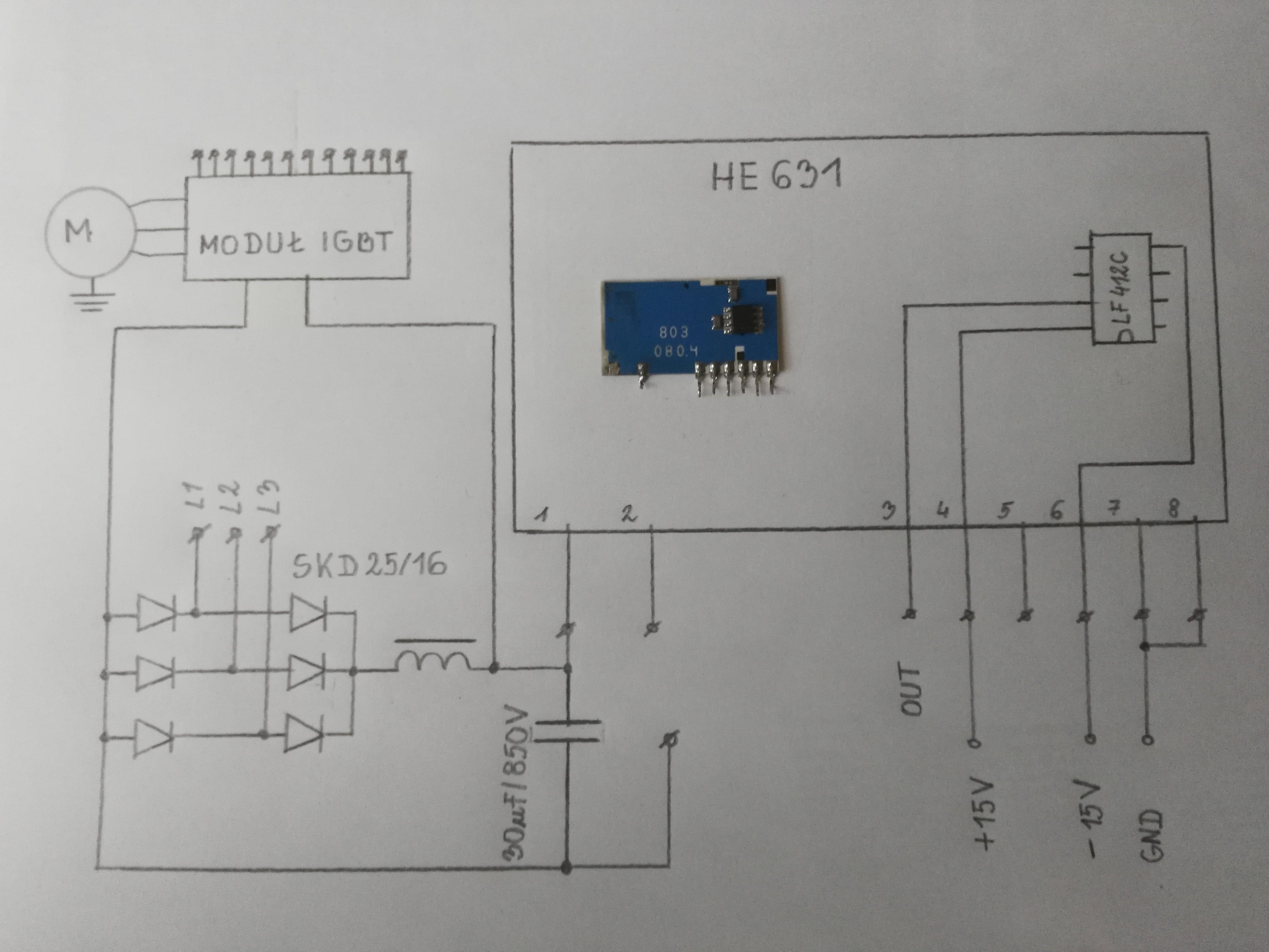 Parę lat temu pisałem odnośnie zakupu układu hybrydowego HE 631 występującego w falownikach SEV EURODRIVE i całkiem niedawno udało mi się ten układ kupić na allegro od RGB ELEKTRONIKA. Teraz chciałbym zdobyć notę katalogową tej hybrydy aby się coś więcej na jej temat dowiedzieć a nigdzie jej nie mogę znaleźć .Coś mi się udało rozszyfrować i przedstawiam to na moim schemacie odręcznie wykonanym. Sercem hybrydy jest wzmacniacz operacyjny LF 412C , który jest zasilony napięciem symetrycznym (+15 , -15V) z małej przetworniczki falownika . Według mojej narzuconej numeracji są to piny (4 i 6 ) , (7 i 8) to masa , (3) wyjście z wzmacniacza operacyjnego. Pin (1) jest wpięty do plusa wysokiego napięcia ( ponad 500V) a (2) wydaje mi się że do minusa wysokiego napięcia bo pomiędzy pinami (1 i 2) jest wyfrezowanie w PCB ale czy aby tak na pewno jest chciałbym się dowiedzieć . Opiszę problem . Jak falownik rozebrałem okazało się że uszkodzeniu uległ 3 fazowy mostek prostowniczy na wskutek zwarcia jakie spowodowała hybryda HE631 co widać po jej upalonym pinie oraz wydmuchanej ścieżce w środkowej warstwie PCB wokół pinu (2). Przez to fragment środkowej ścieżki wokół wyfrezowania uległ uszkodzeniu nie widzę dokładnie z czym miał by być połączony pin (2) tylko się domyślam że z minusem wysokiego napięcia i dlatego pomocna by mi była nota katalogowa tej hybrydy. Czy ktoś posiada taką notę katalogową ?