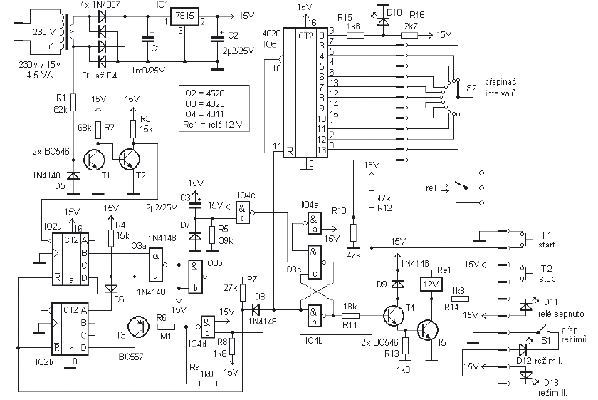 Niespotykane często rozwiązanie o bardzo dużym zróżnicowaniu podtrzymywania czasu od 3,5 sekundy do 6,8 godziny wykorzystujące jako zegar zewnętrzny częstotliwość sieci energetycznej (podobnie jak w starych zegarkach elektronicznych). Do dyspozycji mamy przyciski TI1 oznaczający rozpoczęcie zliczania i TI2 czyli przerwanie zliczania. Przełącznik S1 umożliwia wybranie trybu - są dwa tryby pracy a przełącznik S2 umożliwia wybranie zadanego czasu działania.