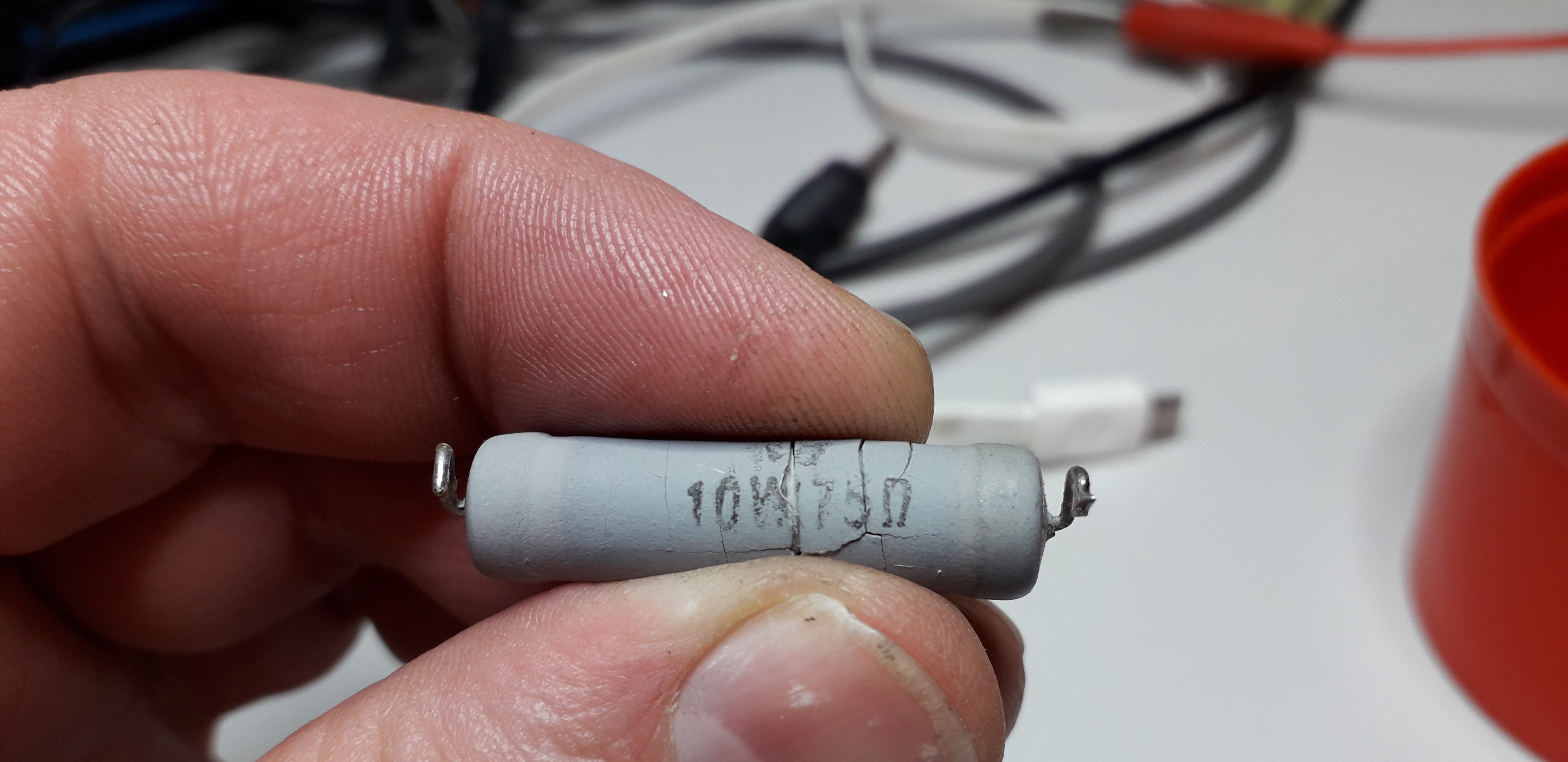 Oryginalnie był umieszczony w koszulce termokurczliwej, po rozcięciu widać że został rozerwany i ceramika odłupana, usunąłem trochę ceramicznej otuliny i udało się odwinąć kawałek drutu. Było to w okolicy połowy długości i pomiar tej części wykazuje ok 30om. Dalej wszystko pasuje. Element wykonany jest jak klasyczny rezystor drutowy.