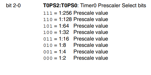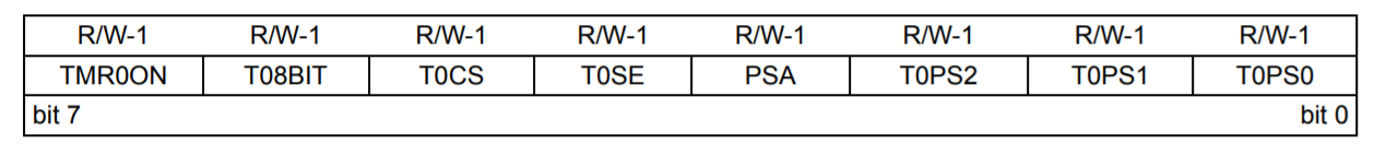 - T0CON - tutaj konfigurujemy działanie Timera 0 (włączamy go, ustawiamy prescaler)