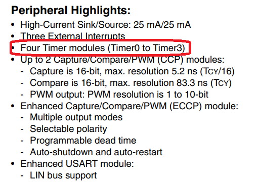 Każdy z nich może wywoływać przerwanie w momencie swojego przepełnienia. Trzy z nich (mogą być) 16 bitowe, czyli mogą zliczać 2^16 (65536) impulsów. Dwa z nich obsługują zliczanie impulsów z innego źródła niż zegara wewnętrznego (te źródła są na określonych pinach). Timery te obsługują też ustawienie preskalera (osobno dla każdego timera), co pozwala zliczać np. co czwarty impuls z danego źródła.