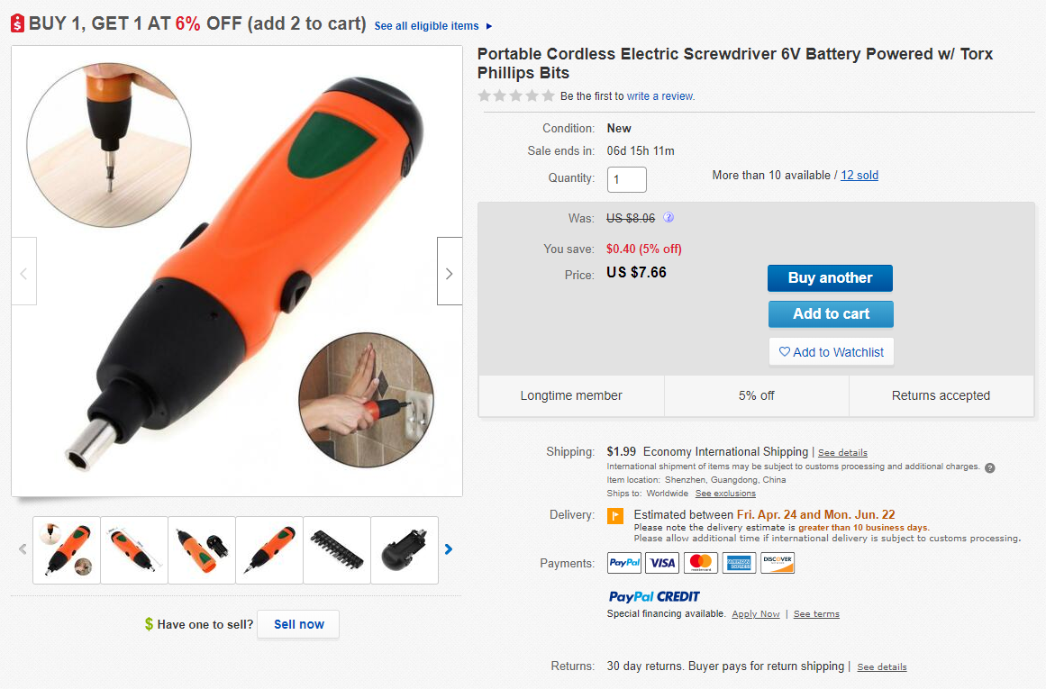 Wkrętarkę znalazłem na eBayu pod hasłem Portable Cordless Electric Screwdriver 6V Battery Powered w/ Torx Phillips Bits: