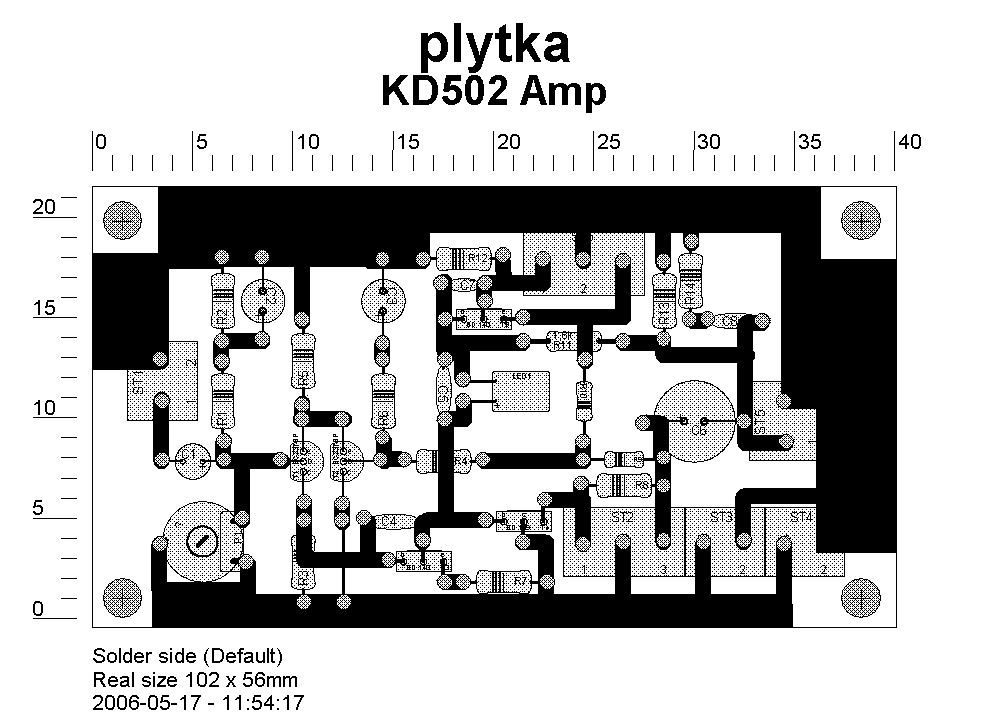 Podczas przeglądania mojej kolekcji opisów i schematów związanych z estradą natknąłem się na zapomniany układ pieca gitarowego który dostałem od znajomego muzyka z byłej NRD.Z tego co pamiętam schemat i płytka były przez niego odrysowane z pieca Vermony lub Regenta, ale dokładnie to nie wiem.Zmontowałem tego kilka sztuk dostosowując elementy elektroniczne na nasze ówczesne warunki i musze przyznać że przy mocy ok. 30-40W to pod gitarą chodził znakomicie.Układ jest prosty i nie skomplikowany.W końcówce mocy zamiast tranzystorów sterujących BD139-140 można użyć BC211-313 i nie padną.Regulacja układu sprowadza się do ustawienia PR220k tak aby na wyjściu wzmacniacza przed kondensatorem uzyskać pół wartości zasilania oraz doborze